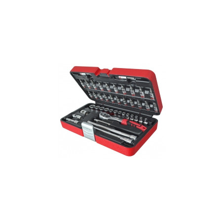 Coffret compact composé de douilles et accessoires en acier chrome vanadium. Composition : 1 cliquet réversible poignée bi-matière, 1 manche porte douilles à entraînement carré, 13 douilles 4 à 14 mm, 2 rallonges 50 et 150 mm, 1 rallonge flexible 150 mm, 1 cardan, 1 douille porte embouts de vissage, 23 douilles à embouts de vissage (plats, Ph, Pz, Tx, Hex).