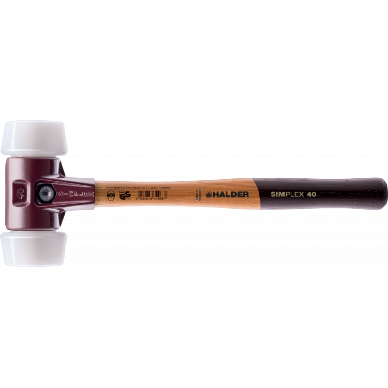 Des embouts spéciaux D50mm sont montés dans le boîtier D40mm de ce maillet SIMPLEX de la série 3007. Les surfaces d’impact surdimensionnées permettent une protection maximale et un traitement en finesse des pièces à la surface délicate.