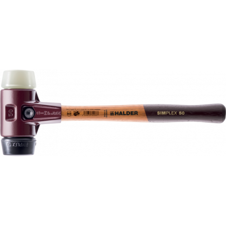 Maillet SIMPLEX avec combinaison d’embouts caoutchouc chargé (noir, moyennement dur, amortissant, sans odeur, résistant à l'usure) / nylon (blanc, dur, très résistant à l'usure, pas d’écaillage même à des températures négatives, résistant à l’huile et à la graisse).