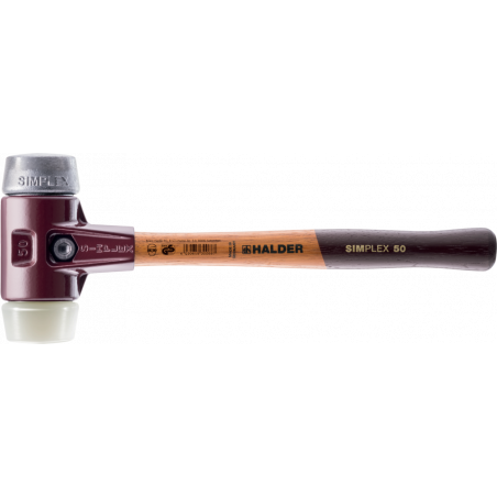 Maillet SIMPLEX avec combinaison d’embouts nylon (blanc, dur, très résistant à l'usure, pas d’écaillage même à des températures négatives, résistant à l’huile et à la graisse) / métal doux (argenté, dur, insensible à la chaleur).