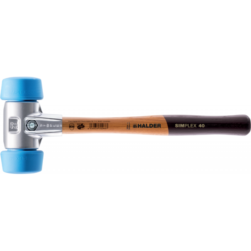 Des embouts spéciaux D50mm sont montés dans le boîtier D40mm de ce maillet SIMPLEX. Les surfaces d’impact surdimensionnées permettent une protection maximale et un traitement en finesse des pièces à la surface délicate. La série 3101 est équipée des deux côtés avec un embout bleu TPE souple (série 3201). T">