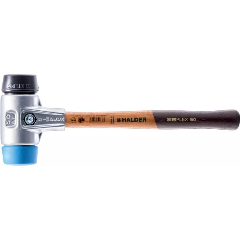 Maillet SIMPLEX avec combinaison d’embouts TPE souple (bleu, souple, sans marquage) / caoutchouc chargé (noir, moyennement dur, amortissant, sans odeur, résistant à l’usure)