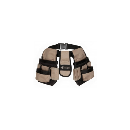 En polyester cousu et riveté. Avec ceinture nylon ajustable. Composée de 4 grandes poches, de 2 poches de taille moyenne, de 6 poches fines, de 10 logements pour tournevis, crayons, craies, de anses nylon pour marteaux, massettes, maillets, hachettes, et d'une encoche pour mesures roulantes. 22 compartiments au total.