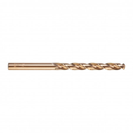 Forets métaux rectifiés HSS enrichi à 5 % de Cobalt selon norme DIN 338. Finition polie., Angle d’attaque des bords de coupe à 135° avec pointe auto centrage sans pointage., Spirale « type N » à coupe droite., Excellente résistance à la chaleur et à l’usure dans les aciers fortement alliés jusqu’à 1000 N/mm² comme les aciers ayant reçu un traitement thermique ou contre l'acide., Convient pour le perçage d'aciers à haute teneur en alliages et de métaux ayant des résistances à la traction supérieures à 1000 N / mm² comme les aciers résistants à la chaleur et aux acides et l'acier inoxydable., Tige à 3 méplats de 5 mm de diamètre pour une meilleure adhérence et empêche le glissement du mandrin., Couleur : bronze