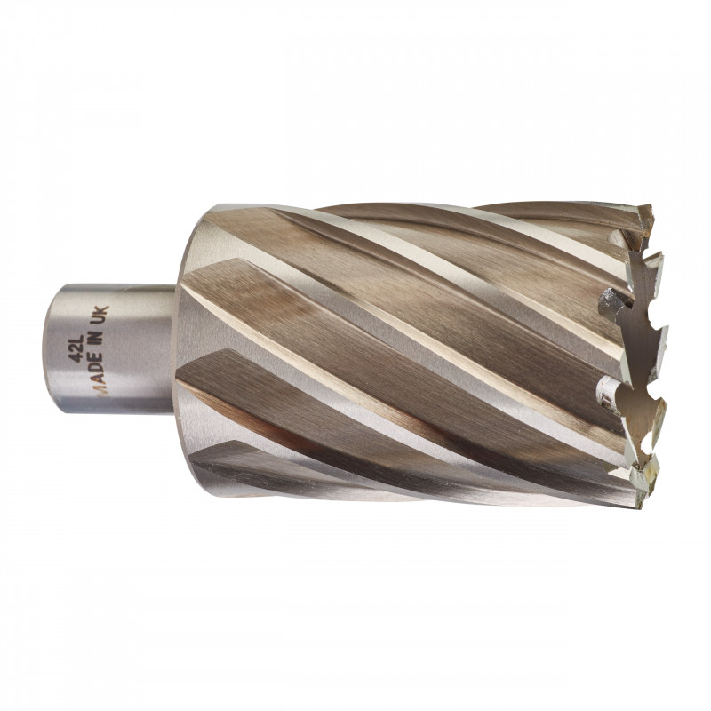 100% plus rapide- Le perçage avec trépan permet de travailler moins de matière qu’un perçage classique. La denture à 2 taillants affûtés par dent permet des vitesses d’avance nettement plus rapides tout en réduisant les frottements et résistances., 30 % + productif - Comme le perçage avec trépan ne fore que la périphérie du trou, il faut beaucoup moins de puissance pour percer. Plus le diamètre est important, plus grand est le gain de productivité., Durée de vie accrue - Étant moins sollicité qu’un foret classique, les taillants des trépans HSS Milwaukee® sont d’une longévité exceptionnelle et durent vraiment plus longtemps. La géométrie de coupe et l’épaisseur des trépans garantissent une résistance exceptionnelle sans risque de rupture., Trépans HSS à paroi épaisse pour une durée de vie accrue., Emmanchement standard Weldon 19 mm., Profondeur de carottage 30 et 50 mm.