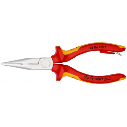 25 06 160 T BK Pince demi-ronde avec tranchant Convient pour les travaux nécessitant une prise et une coupe de précision. Mâchoires demi-rondes, longues et effilées. Intérieur des mâchoires strié. Avec tranchants pour fils doux, mi-durs et durs. Tranchants trempés par induction, dureté d'env. 61 HRC. Pince avec œillet isolé intégré pour fixation d’un dispositif antichute. carte LS/blister.