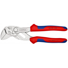86 05 150 Pince-clé remplace tout un jeu de clés plates, métriques et en pouces. mâchoires lisses ménageant les robinetteries chromées au montage!. Convient aussi parfaitement pour saisir, tenir, presser et mettre en forme. Pas d'endommagement des bords des robinetteries chromées grâce à une pression des mâchoires sans jeu. Réglage rapide à même la pièce par simple pression du bouton. Pas de déréglage accidentel des mâchoires ni de glissement de la charnière. Saisie sans à-coup de toutes les largeurs jusqu'à la capacité maximale indiquée grâce à ses mâchoires parallèles. La course entre les mâchoires permet un serrage et un desserrage rapide selon le principe du cliquet. Force de serrage élevée grâce à une transmission de force manuelle multipliée par 10. la pince-clé miniature pour les travaux de mécanique de précision. Pince-clé universelle idéale en format de poche. l'élément indispensable dans votre trousse à outils.