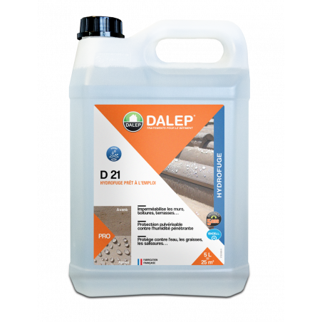 L’Hydrofuge Oléofuge Dalep 21 est un traitement imperméabilisant prêt à l'emploi, pour protéger les surfaces contre l’humidité, les graisses et les salissures. Il offre une protection longue durée sans modifier l’aspect des matériaux.